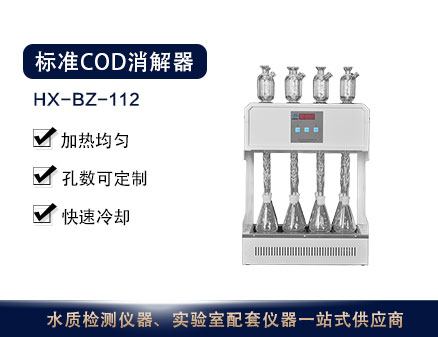 HX-BZ-112型標準COD(cr)消解器遵循了國際標準(ISO)和國家標準(GB)的基本原則,保證了回流加熱微沸2小時的消解操作,試劑溶液的配制和加入量都和GB法一致,確保可靠準確的分析結果。儀器的化學溶液配制、操作和COD的計算遵照GB11914—89,低于50mg/L的COD水樣可通過稀釋滴定劑和氧化劑來提高準確度,高于1000mg/L的COD水樣,可以通過水樣的比例稀釋來完成測定。